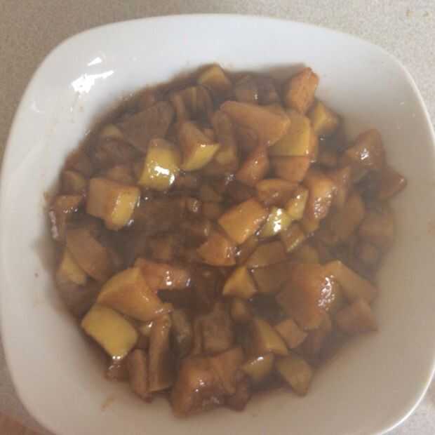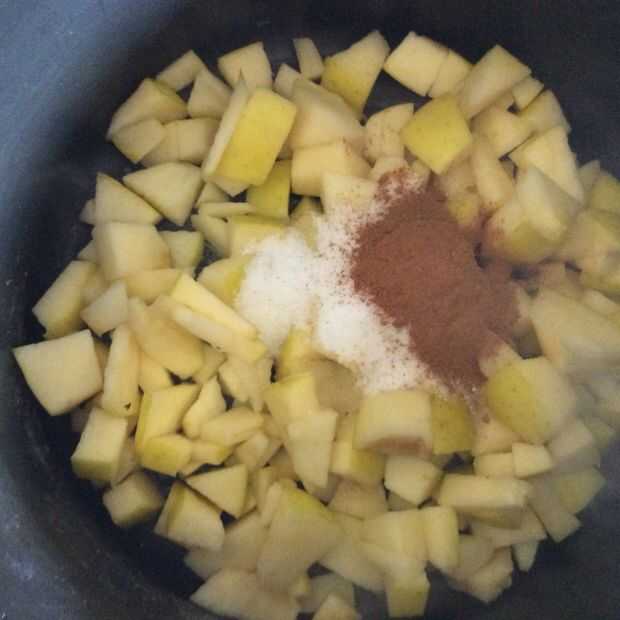 Trocear una manzana y lo de la base. Luego poner en una cazuela con 4 cucharadas de azúcar y 11/4 de cucharadita de canela. Poner la olla sobre fuego medio alto. Cuando la manzana está blanda al pincharla con un tenedor tomar inmediatamente la olla fuera del fuego.