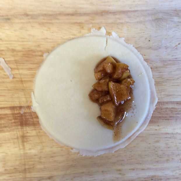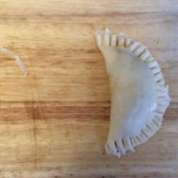 Obtener el círculo de la base de tarta y poner 1 1/2 cucharadas de relleno en él. Luego utilizar agua en los bordes y, utilice un tenedor para cerrar.