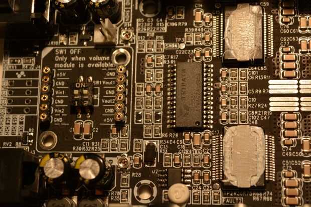 El amplificador viene con un ventilador y disipador y el chip de controlador de sonido actual se encuentra por debajo de este disipador de calor. Quitar los ventiladores y el disipador de calor.