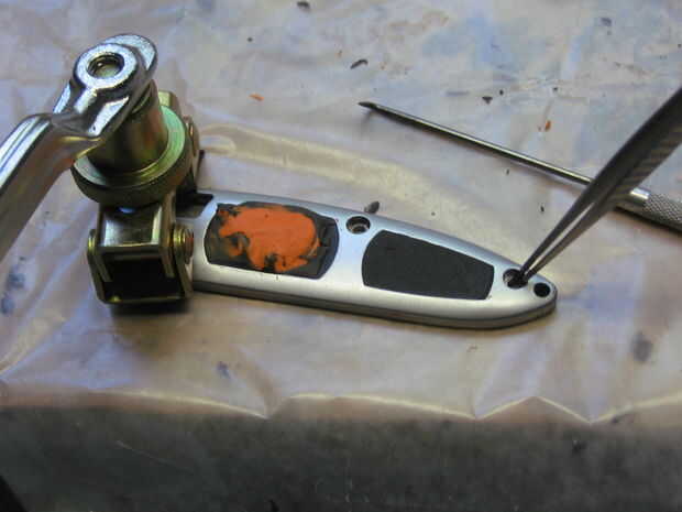 Con los pequeños pedacitos de despejaron lejos que puse acerca de quitar el exceso superior agrupan en material para revelar el diseño. Sujeta el cuchillo a mi banco para guardarlo de la mudanza. Luego amplié el filo de mi navaja en cuanto pude. Entonces empujó el cuchillo a través de lo montículos Sugru algo parecido a un cepillo miniatura. Repetí esto hasta que el diseño fue completamente revelado y el Sugru era nivel con la parte superior de la cavidad de agarre.