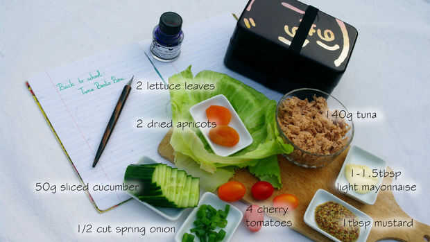 1. Comience por preparar todos los ingredientes. Mezclar el atún, la mayonesa y la mostaza en un recipiente, asegurándose de que todos los ingredientes están bien mezclados. Luego corte los albaricoques secos en cuadritos con unas tijeras. Se puede utilizar un cuchillo pero son un poco pegajosos dentro así tijeras darán un corte más limpio. Finalmente, cortar los tomates cherry por la mitad. La cebolleta también debe cortarse en pequeños trozos y el pepino se debe rebanar fino.