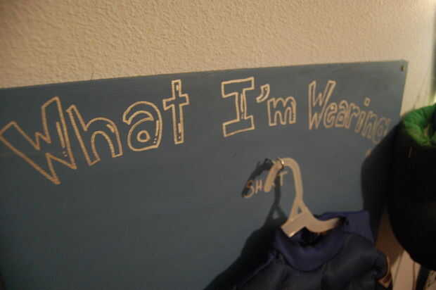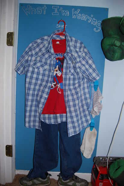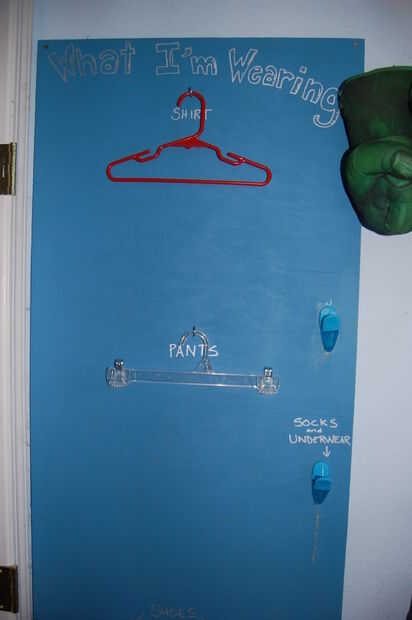 de un pedazo de madera contrachapada, o una pieza comprada sobre el tamaño de niño de escuela primaria, este tablero planes la noche antes de lo que usará su hijo. Diseño para ir detrás de la puerta de mi hijo y pintado para que coincida con la decoración del espacio interior. Se colocaron dos ganchos para colgar perchas de sostener sus camisas y pantalones/pantalones cortos. Una suspensión de "fondos" se utilizó con el estilo de la abrazadera porque era más fácil sostener sus pantalones. Otros dos clips (material de oficina) estaban pegados a la parte de la Junta para mantener su ropa interior y calcetines. Le puse sus zapatos en el zócalo para convience. Se trata de un enorme ahorro de tiempo en las mañanas y le enseña a escoger su propia ropa. ¿Por qué no hacerlo para mi secundaria??