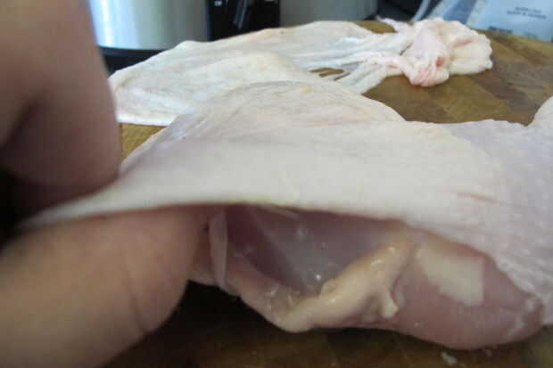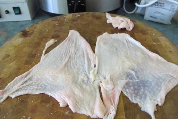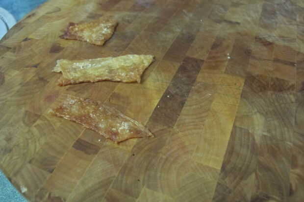 Primero necesitas suavemente (sin desgarramiento) retirar la piel de la mama (no pude encontrar la piel de senos por lo que estoy usando la piel de una pierna o muslo) después de quitar la piel cortada "uniforme", alrededor de 2 x 3 pulgadas o menos, la piel se reducirá considerablemente. Precaliente el horno a 300 grados centígrados. Colocar la piel sobre la parrilla. Ligeramente la piel de la sal (recuerda colocar una bandeja debajo de la grasa gotee en) lugar en el horno en la bandeja media durante 25 minutos. Dejar sobre la parrilla hasta que esté listo a la placa.