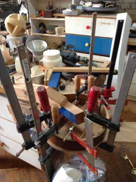 Utilizando a todo tipo de pinza que pude encontrar, presiona la parte superior de la mandolina (que era donde estaba ocurriendo el hundimiento) en mi espacio de trabajo plana. La idea aquí a aplanar la parte superior y revertir el hundimiento del cuerpo. Figura que ya era capaz de doblar hacia abajo, también hay espacio para que pueda volver a su forma original. En el caso de mi mandolina, aplica presión a la parte inferior del instrumento (más cerca de la culata) primero y poco a poco ha añadido más presión más cercano al cuello con el tiempo. Asegúrese de sujetar el instrumento en varios puntos de cada refuerzo. Deje el instrumento durante al menos 24 horas. (Creo que dejé sentarse durante dos días la mina)