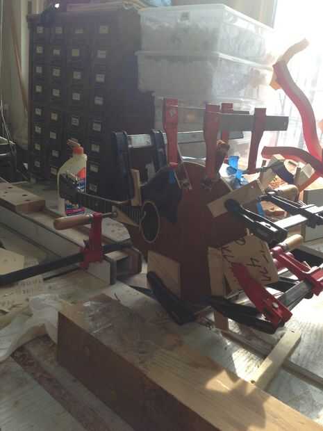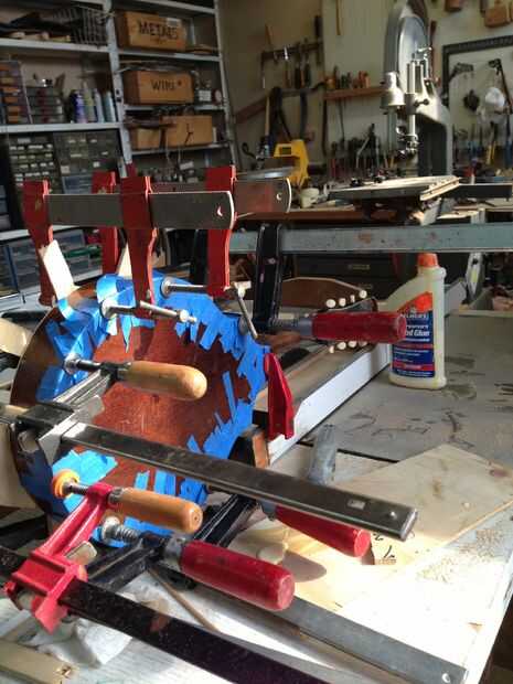 Cuidadosamente había aplicado pegamento para madera a la parte posterior de la mandolina y había unido al cuerpo. Entonces grabó la mandolina con pequeños trozos de cinta adhesiva (esto no debería dañar cualquier acabado) a lo largo del diámetro inter de su cuerpo aplicando tanta presión como sea posible. Luego sujeta la parte posterior del cuerpo y déjela en reposo durante 24 horas. Después de quitar las grapas y cinta, lijar los bordes para eliminar todos los puntos ásperos, atornillar la pieza de cola y por último, ha añadido un nuevo par de cuerdas.