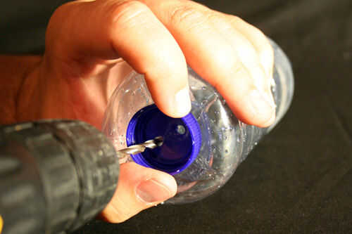 Uno de los casquillos y utilizarlo como una guía para taladrar (2) orificios en la parte inferior de una de las restantes botellas intactas. Esto terminará siendo botella {b} en el siguiente diagrama.