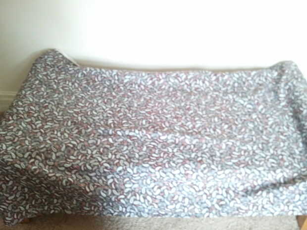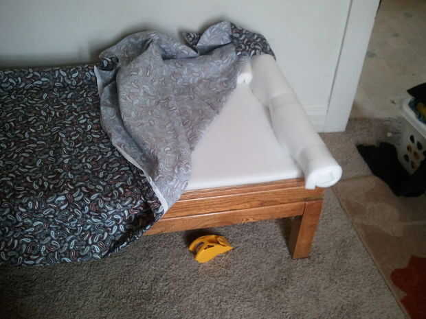 Ponen su tela sobre la espuma, como woud con una funda, pero con mínima metiendo. Corte las esquinas de los brazos para que no voluminosos. No rocíe, hasta que lo tienes trazado y yor está totalmente listo Coloque tp. Comenzó en el brazo y hace mi camino de izquierda a derecha, rociar la espuma y la parte trasera de la tela para mejorar la adherencia, ir sección por sección, como papel de pared, alisando la tela que usted vaya.