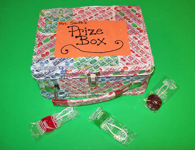 4. mientras se seca el recipiente, hacer un cartel en el frente! Use tijeras con bordes de fondo para recortar una forma rectangular de papel de construcción. Luego use el rotulador de punta fina para escribir un mensaje como "Caja de premio".