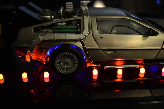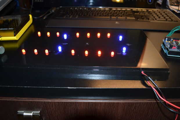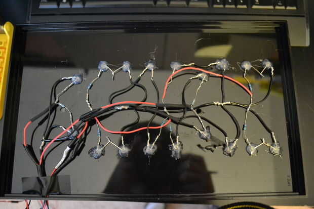 Mida y 14 orificios en la base para el LED naranja (fuego). Estos deben ser en consonancia con los neumáticos. Yo también los orificios perforados para cuatro LEDs azules para algún efecto extra. He instalado estas detrás de cada neumático por lo que están protegidos de la vista directa. Utilizando un voltaje de 4.5V, el LED de 14 fuego tiene que ser conectados en una matriz de 2 x 7 mediante resistencias de 27 ohm. Los cuatro LEDs azul deben ser conectado en paralelo con resistencias de 68 ohmios. Utilice pegamento caliente para fijar los LEDs.