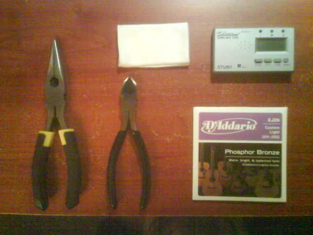 estos son los pasos para volver a la secuencia una guitarra acústica común.Paso 1: Herramientas necesarias Herramientas necesarias-Cuerdas nuevos-Herramienta cadena-Sintonizador-Tijeras wire (opcionales)* Nota *Muchos alicates tienen sección que pued