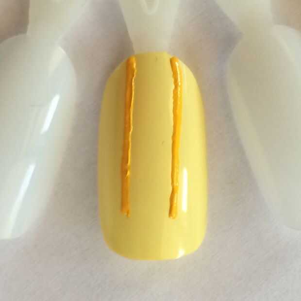 A continuación, con un amarillo más oscuro (yo usé una pluma de Migi Nail art en amarillo clásico), pintura dos rayas abajo el clavo. Tomé mis líneas un poco más lejos de lo que debería. Tienes que parar las líneas donde se iniciará la plata línea horizontal. Esto evita que las líneas creando una protuberancia extraña cuando pintas sobre él más adelante.