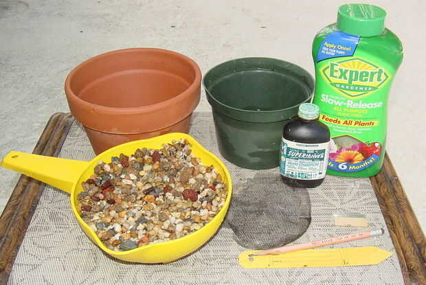 Círculo de pantalla (salvado de un proyecto de harneado) poner en la parte inferior de la maceta de plástico. Evitará que la grava caigan en los agujeros de drenaje.