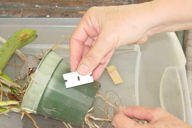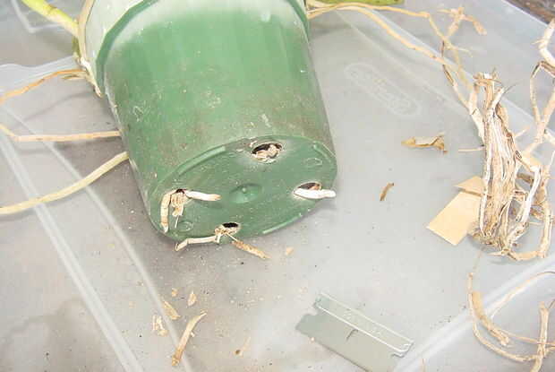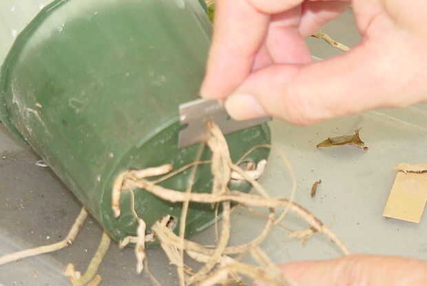 Yo sabía que iba a tener que cortar la parte sobrante de las raíces que crecen hacia fuera el fondo de la olla. Para esto usé la nueva cuchilla de afeitar. Uso cuidado de no cortar yo corte las raíces con el fondo de la olla.