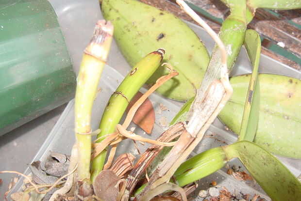 Para eliminar aquellos viejos tallos debería poder tirar hacia abajo, y de la orquídea de crecimiento, o puede necesita recurrir a la tijera... usando cuidado no nick las piezas que desea mantener. Como retirar los tallos duros antiguos, usted puede encontrar que algunas de las viejas raíces seco lejos también caerán.