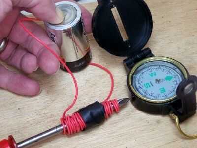 Energiza la bobina con una batería de linterna del viejo. Uno de los cables en mi bobina es más corto que el otro y encontré que si conecto el cable más corto hasta la punta positiva (+) de la pila, el destornillador temporalmente se convierte en un imán que atrae el polo sur del imán de la brújula. Ahora sé cómo conectar las baterías para fortalecer el imán en el capturador.