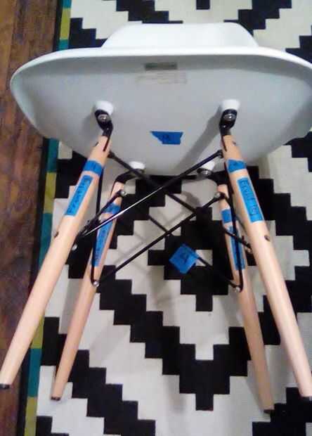 El asiento de la silla, las piernas, soporte entrecruzado negro y la bolsa de Ziplock con tuercas y tornillos están marcados por número. Las patas están etiquetadas "pata delantera" y "atrás de la pierna" así. (Foto #4 la silla).