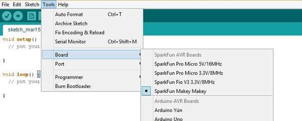 Paso 3 - Abra el IDE de arduino y vaya a Herramientas > Junta ahora tienes Chispa divertida Makey Makey en la lista de tablas.