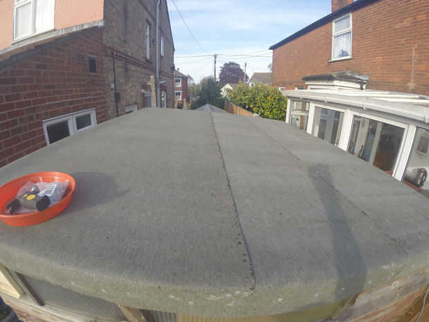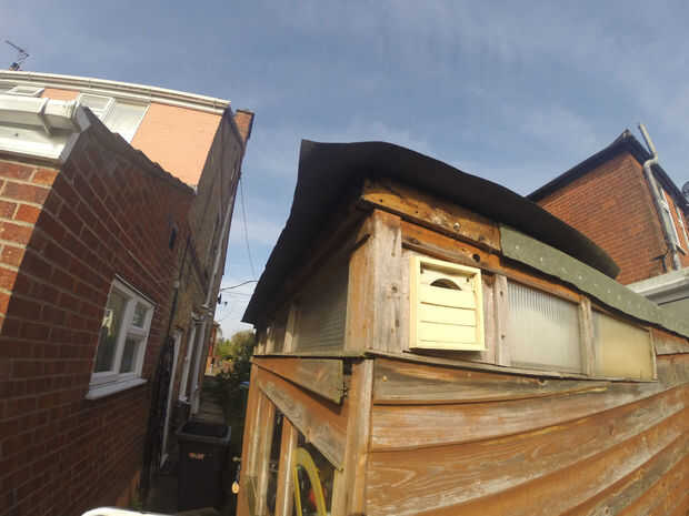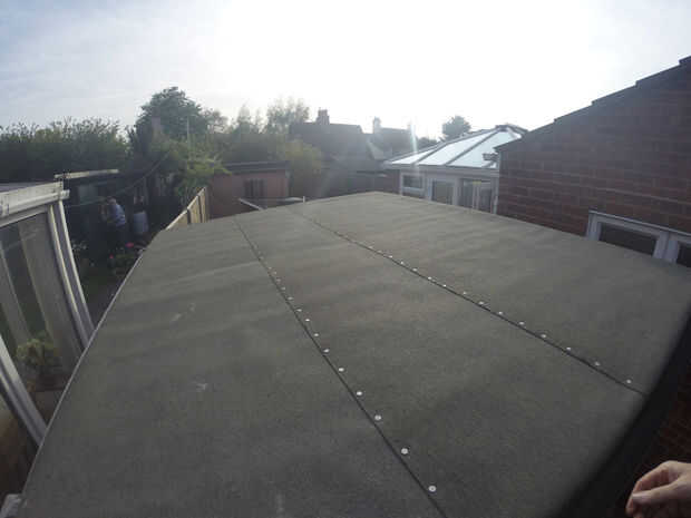 Ahora, de nuevo en la Cruz del cobertizo y clavar los bordes superpuestos de fieltro. No se pueden tener demasiados clavos sujetando su fieltro - un borde suelto será eventualmente rip si es sorprendido por un fuerte viento.
