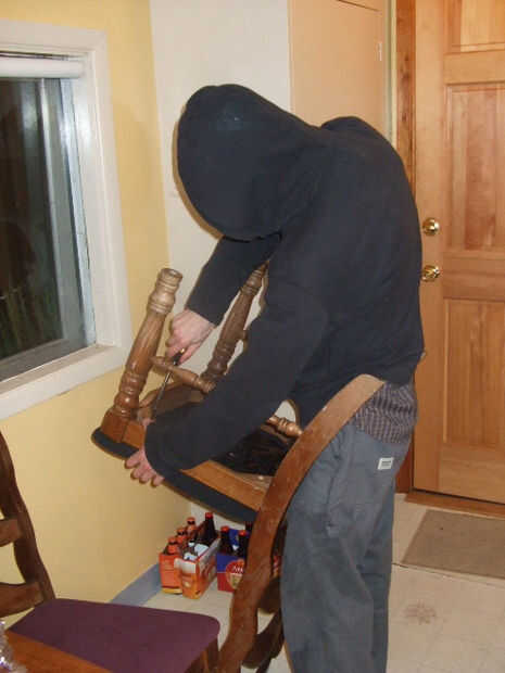 Voy a convertir esta vieja silla en un soporte portátil para mi sierra. (como se muestra en el cuadro #1)Paso 1: Quitar el asiento de la estructura de la silla Primero necesito voltear la silla boca abajo para acceder a los tornillos que la sujetan a