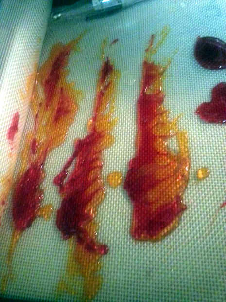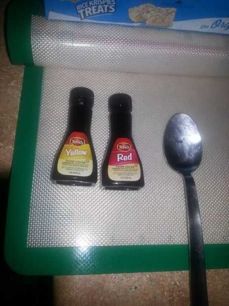 Inmediatamente, añadir 2 gotas de colorante amarillo y mezclar. Con una cucharada cuidadosamente rocíe el azúcar derretida amarillo en la alfombrilla de silicona en una línea recta. Establecido con seguridad su pan. Con el resto de la mezcla una gota de rojo y revolver. Luego colocar parte del naranja azúcar derretido a lo largo de la misma línea que el amarillo. Cuidadosamente tome un palillo de dientes y mezclar colores para ver como las llamas.