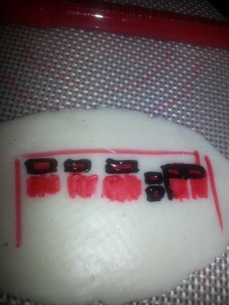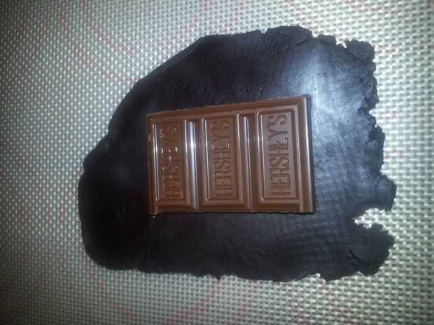 Romper una sección de un Hershey bar y traza una pieza del mismo tamaño de negro forma-n-amaze. Aplicar agua en la parte posterior de la sección de negro y se aplican a la barra de chocolate.