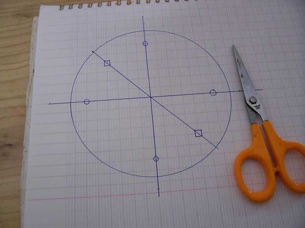 Dibujar la siguiente plantilla con un CD-ROM. Los 4 orificios redondeados se necesitarán para montar la rueda. Los 2 agujeros marcados con un cuadrado son los agujeros de la venda de elástico para el mecanismo interior.