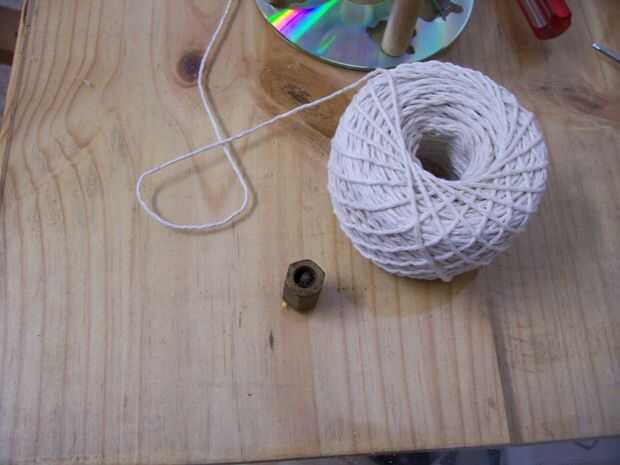 Haz un perno pesado y un trozo de cuerda. Instale el perno con la cadena. Este será el mecanismo interno que hará que la rueda de CD-ROM retorno.