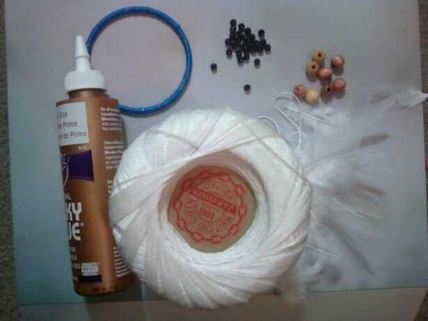 punto el cazador de sueñosPaso 1: Se necesita hilo de elección, ganchillo tamaño F, anillo de madera elección de tamaño, no en imagen plumas y cuentas de la opción.Paso 2: Hacer un deslizamiento la puntada y poner en gancho y fije al aro con punto ba