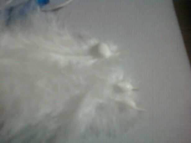 Plumas y añadir pegamento en los extremos de ellos. Luego deslizar en el grano grande colgado de la mitad. Limpie el exceso con cuidado.