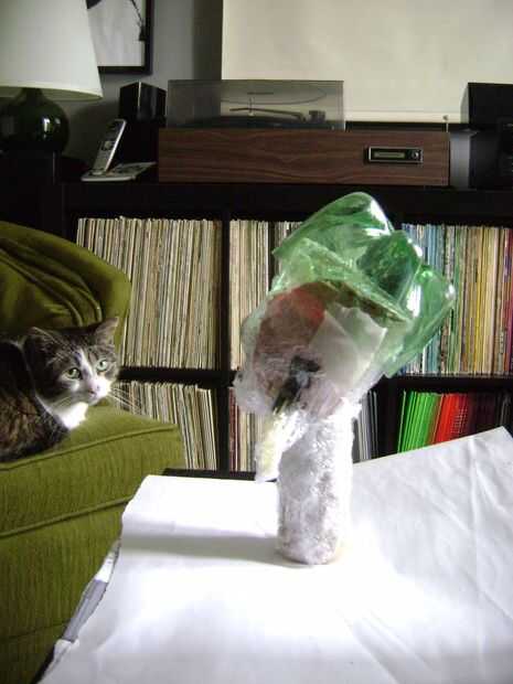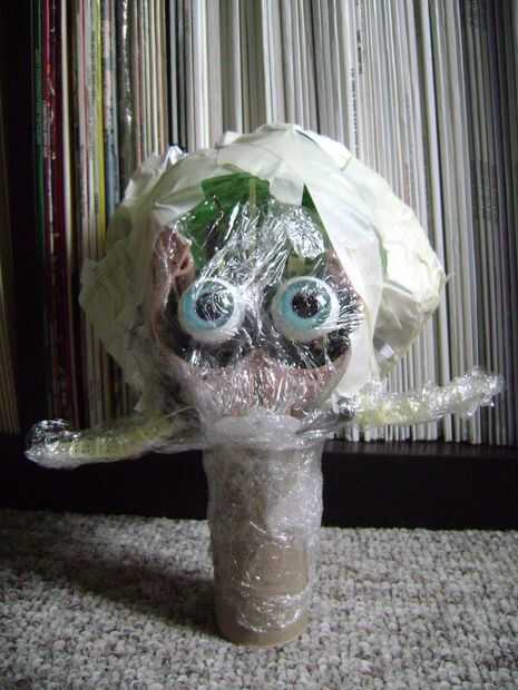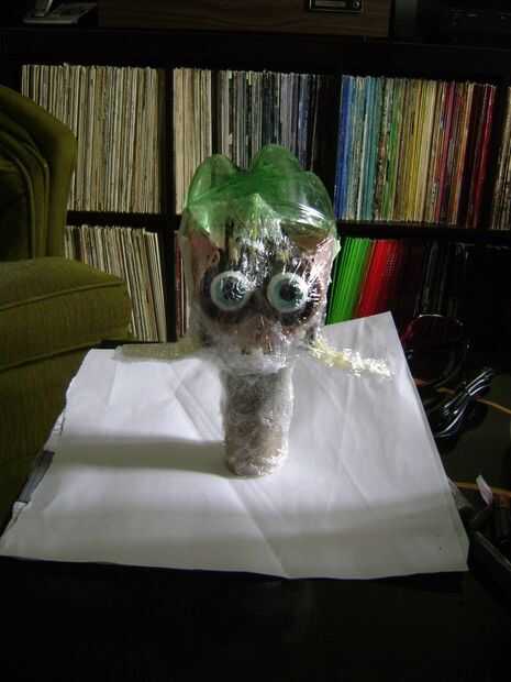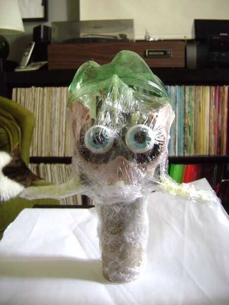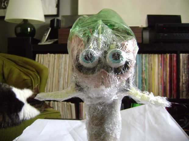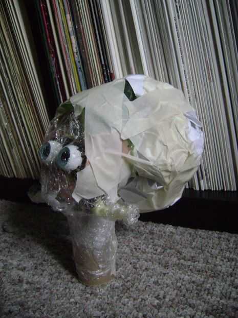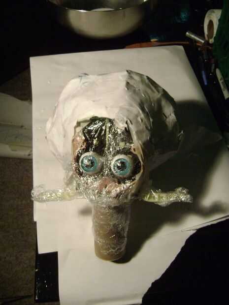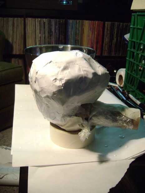 Cubrió los pedacitos de furby en cling wrap y luego construido la forma del cerebro de Krang con parte de un pop botella de 2L, papel de desecho y cinta adhesiva. Hice una capa de papel maché sobre la cabeza para darle un poco de fuerza extra para aguantar bajo la arcilla plastilina.