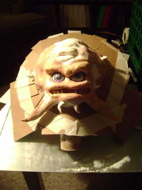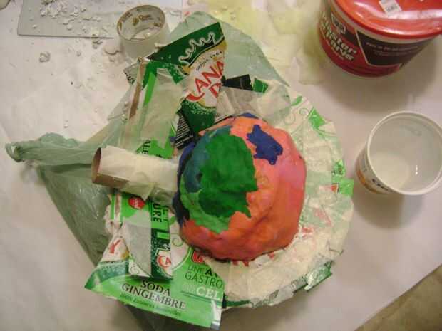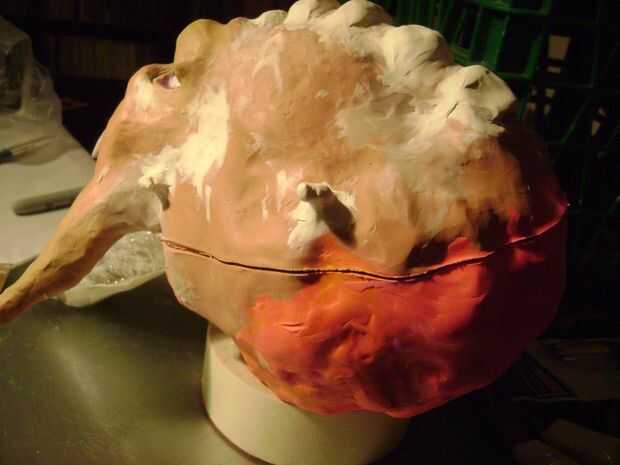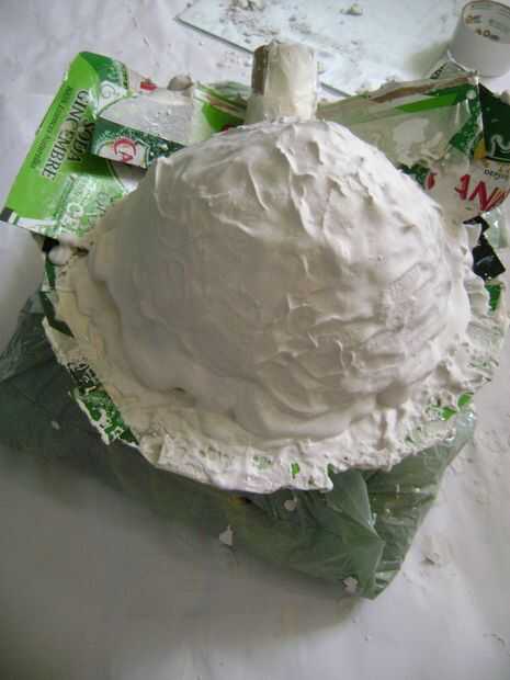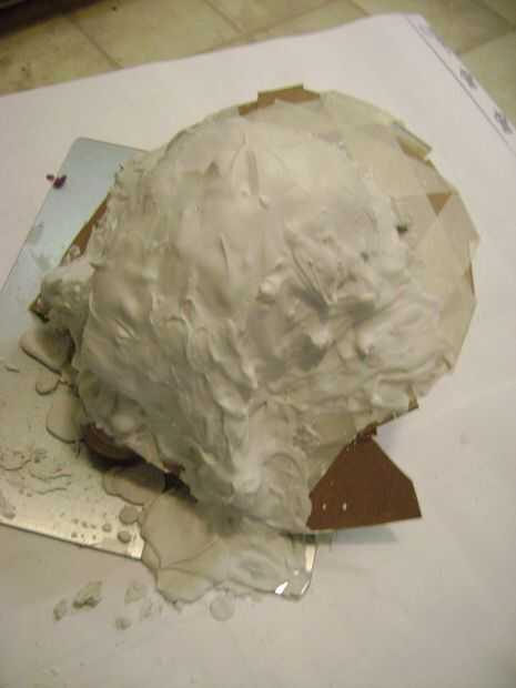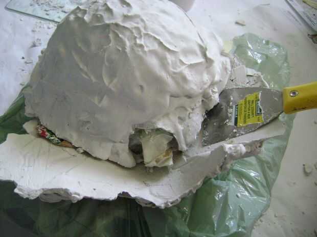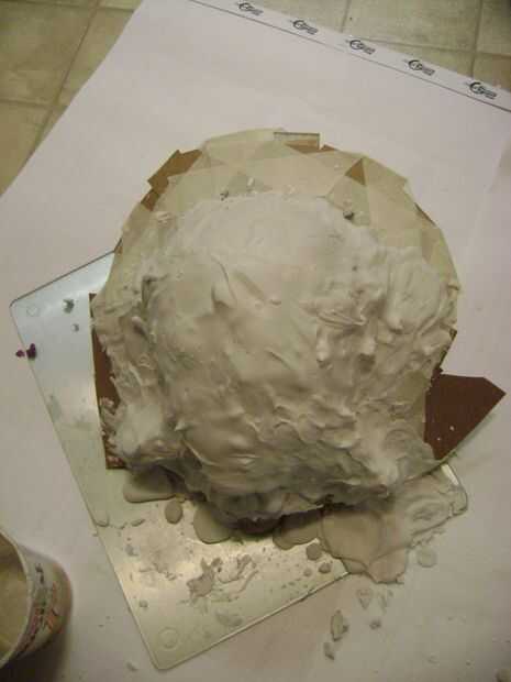 Utilicé tiras de cartón delgado y cinta de enmascarar a Krang se dividen en dos partes. Para que hacerlo más fácil quitar el molde, apliqué vaselina. Luego mezclan un lote de yeso de París y difunda en.