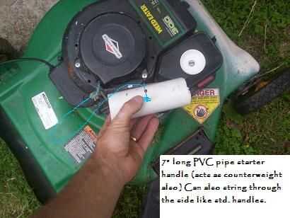 Hice un ponderado arrancador PVC mango para reemplazar un controlador que falta y un destornillador que se utilizaba para la manija de esta podadora de encontrar basura. (Compruebe Freecycle y programas similares a encontrar Segadoras "muertos" que a menudo sólo necesitan un poco TLC o 1 parte a ejecutar. Muchas de estas Segadoras fueron $100-150 nueva y no vota mucho cuando necesitan atención, como tarifas de tienda $50-100/ hr.