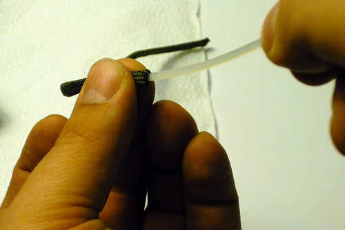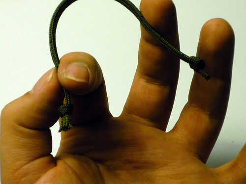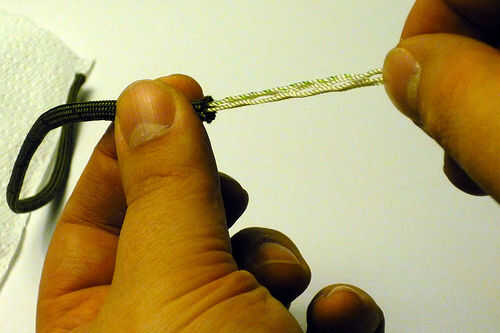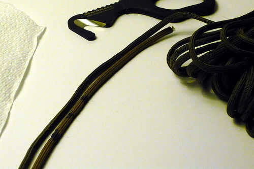 Utilizando la plantilla (longitud depende de preferencia y el tamaño de ziptie), corte una sección de paracord con una herramienta afilada. Tira el paracord de sus filamentos internos. Use un encendedor para sellar los extremos para evitar que se deshilache. Corte el extremo de fijación de la ziptie de deslizarse el ziptie en el paracord. Ate cada extremo con un nudo apretado, pequeño.