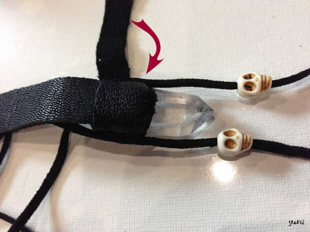 Tomar 2 piezas largo de cable de cordón de gamuza, medir la parte superior de la cabeza a su vientre para la longitud de cada cordón. Añadir los granos de cráneo un poco por encima del extremo de los cordones y pegar en su lugar.
