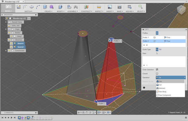 - Usando una función de loft crea un sólido Extruyendo desde la base y terminando en el círculo superior