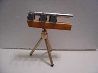 El producto final montado en un pequeño trípode. Recuerde que al colocar el puntero láser para apretar los tornillos lo suficiente a sostener el láser en su lugar pero no romperlo. El tornillo del botón debe sólo apretarse lo suficiente para mantenerlo hacia abajo.