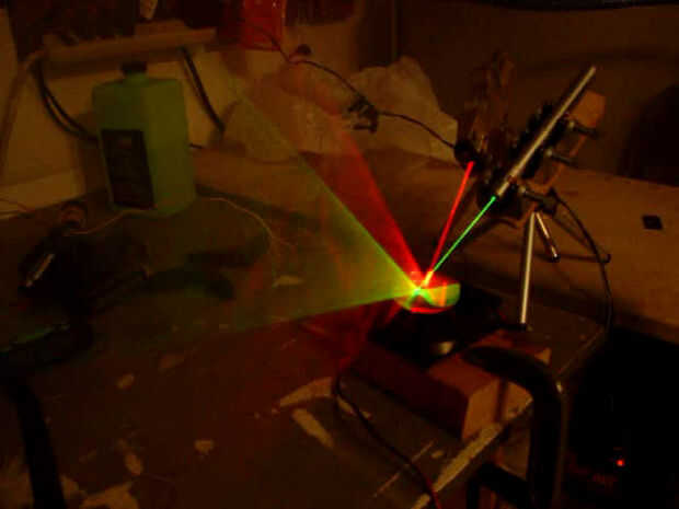 El módulo reflector es realmente un concepto simple pero puede ser un poco difícil de construir. Su trabajo consiste en reflejar el haz láser en un ángulo que cambia constantemente para hacer un patrón circular. Esto se logra colocando un espejo en un ángulo en el eje de un pequeño motor eléctrico. Como el motor gira, el ángulo se cambia haciendo un patrón circular.