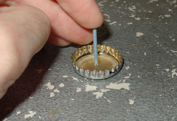 Encontrar una cápsula de metal en buen estado, las desventajas de la torcedura de botellas de cerveza son perfectas porque mayoría twist off caps se quitan sin daño a la tapa. Utilice un clavo no más grande que el eje del motor para hacer un agujero en el centro de la tapa. Utilizando un clavo como un golpe en lugar de una broca pequeña nos dará algunos había añadido agarre del motor que no podríamos conseguir con un agujero limpio.