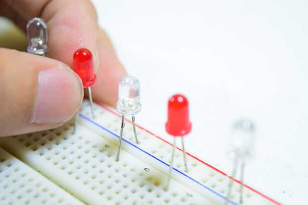 Conecte los cables de positivo de cada LED en pernos # 2,3,4,5,6 de la Arduino. Los conductores negativos de cada LED va al riel negativo de la placa. El riel negativo de la placa va a la tierra del Arduino.