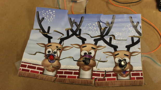 Coloque los LEDs en los agujeros de la nariz del reno. Cambiar el jumper en el escudo de EasyVr a SW, haga clic en la lupa de arriba a la derecha del software de arduino y esperar a ver si se detecta la EasyVr. Si se detecta la EasyVr comienzo diciendo la palabra gatillo (vamos a contar) con el micrófono en el escudo de Easyvr. (Si no se detecta el EasyVr trate de desconectar del ordenador, conectarlo otra vez y volver a cargar el código de puente EasyVr y el código proporcionado en el paso anterior). Usted debe entonces pedirá que pronuncie un comando en el grupo 1. Usted debe entonces decir "Uno" y uno de los LED deberán encenderse. Como dices "dos" y "tres" el otro LED deberá encenderse también. Ahora tienes un inicio divertido a ayudar a su niño a desarrollar importantes habilidades espaciales a través de la construcción así como de un divertido rompecabezas forma de enseñar conceptos de conteo!