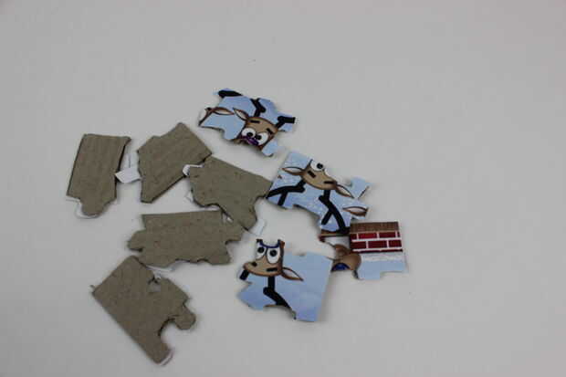 Antes de imprimir la imagen de los tres renos redimensionar para que sea del mismo tamaño que el contorno del rompecabezas. Luego imprime ambas imágenes. Cortar el contorno de las piezas del puzzle con las tijeras y colocarlos en la parte posterior de la imagen y trazar las piezas. (Utiliza las piezas del rompecabezas como una guía de seguimiento para romper tu foto en piezas del puzzle). Una vez que haya trazado corta las piezas con las tijeras y su imagen debe dividirse en piezas del puzzle. Seguir el mismo proceso en la cartulina utilizando el cuchillo Exacto para cortar las piezas. Después de pegue sus piezas del rompecabezas para las piezas del puzzle cartón. Esto le permitirá crear piezas de rompecabezas robusta.