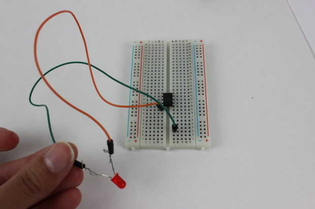 Coloque el LED siguiente como sigue-lugar el cable conectado al positivo en posición F7, coloque el cable conectado al cable negativo en posición E7