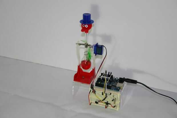Este proyecto de reloj de aves "Solo horas" beber es un extracto de mi aplicación para iPad, "Cómo hacer un proyecto de Feria de ciencia". La hora en binario--está determinada por el movimiento de las aves. Un pájaro móvil es un &quo