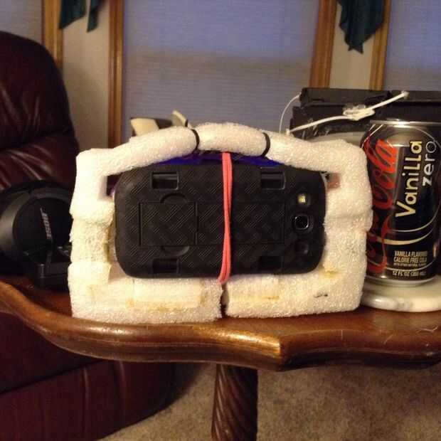 Para asegurar el teléfono, colóquelo en el visor de la plataforma de espuma que ha construido. Jale la tira de la correa hacia abajo sobre la parte posterior del teléfono y la prohibición a través de la ranura en la parte inferior del visor del hilo de rosca. Presione el talón en el compartimento para asegurarlo. Invierta los pasos para quitar el teléfono