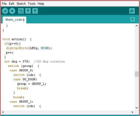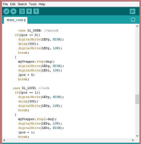 A grupo 1, podemos ver nuestro 'lock' y 'unlock' caso declaraciones. Si el usuario intenta abrir la puerta y la puerta ya está abierta, la luz amarilla se encenderá por un período corto, entonces apaga. Lo mismo cae de una puerta con cerradura dada el comando de 'lock'. Cuando el comando de bloqueo se da a una puerta abierta, el paso a paso gira * grados * pasos. grados es la variable a mi restricción de rotación (90 grados) dividido por grados de mi motor por cociente del paso. El LED iluminado cambiará de verde a rojo.