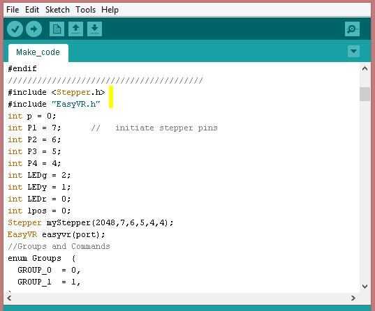Para escribir este código, el primer paso es incluir la biblioteca paso a paso. Podemos encontrar donde las bibliotecas están incluidas en el shell VR encontrando #include"EasyVR.h". A continuación establece nuestras variables globales para nuestros pernos paso a paso, los pernos de LED, nuestra función de control de paso a paso, última posición variable (lpos) y nuestra variable de puesta en marcha (p).