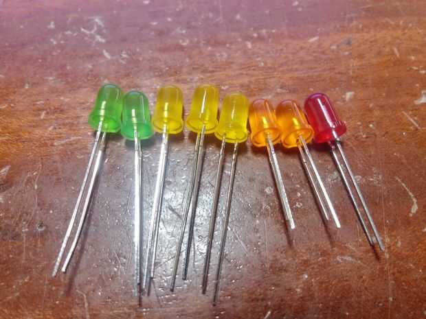 El LED debe todos ser difundido ya que muestra un color incluso agradable en todos los ángulos y no lastima los ojos en la oscuridad. Usé 4 verde, 3 amarillo, 2 naranja y 1 rojo por altavoz.