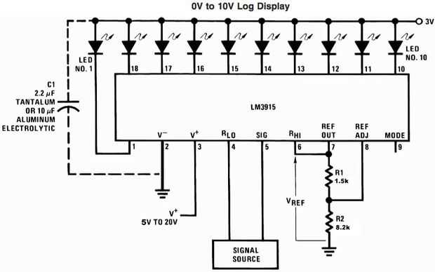 El VU-metro es realmente sencillo de construir. Estamos utilizando el LM3915 bar controlador gráfico y el ejemplo de la hoja de datos es casi exactamente el circuito que se va construyendo. Podemos ver que cátodo de cada LED se conecta a un determinado pin en la IC, por lo tanto tenemos un ánodo común y cada LED es conducido por el IC tirando ese pin a tierra. Como se puede ver, no necesitan resistencias limitantes actuales puesto que este IC es programado para entregar incluso actual a todos los LED usando algunas resistencias en los pines 7 y 8 del CI. Para el resistor R1, usé una resistencia de Ohm 1.5 k y para R2, usé una resistencia de ohmios k 8.2. Esto entregará sobre 12-13mA por LED. Sé que esto parece bajo pero ¿de verdad quieres un brillante rojo LED el brillo en sus ojos escurrimiento 20mA mientras estás en tu PC en la noche? También es un desperdicio de energía, esto también quiere ser práctico utilizar en aplicaciones portátiles.