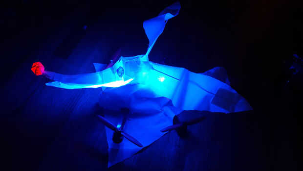 La cabeza se une al quadcopter. El cuerpo puede crearse con un triángulo sencillo corte de tela. Si desea omitir el quadcopter y convertirla en una colgante prop: pegar la cabeza al paño de triángulo y colgar con hilo de pescar.