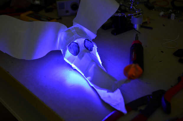 Aquí es un examen rápido de los LEDs en la cabeza. Pongo uno de los leds de 3W azul 3v en el centro de la cabeza.